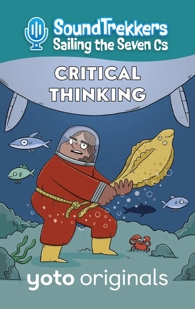 Yoto Says: If there??s commotion in the ocean, seaweed in need, or something amiss in the abyss, the SoundTrekkers will save the day! What do you call it when a girl, her best friend, her almost-grown-up older brother, and a computer called Pickles travel the globe in an enormous whale-shaped submarine, capture the ocean??s most interesting sounds, and post them onto the greatest podcast that ever lived ?? all while thwarting a league of zany undersea villains who are determined to destroy the world??s most precious natural resources just for the fun of it? Why, Soundtrekkers, of course! Join Molly, Jojo, and JP as they sail the seven seas, all while learning about the 7 Cs: Creativity, Compassion, Curiosity, Communication, Collaboration, Community, and Critical Thinking. The Cs help the Soundtrekkers foil the plans of some wacky supervillains, who could all use a lesson in how to live harmoniously with those around them, and protect ?? not wreck! ?? the natural world we all share. This pack includes: Card 1: Creativity – Soothing Sounds After the Soundtrekkers successfully record the gentle popping sound of water flowing through the Great Barrier Reef, they suddenly hear a loud CRACK! coming through their underwater mic. Oh no! It??s nefarious villain Show Tuna (the ocean??s most overly dramatic, compulsively performing theater nerd who disguises herself as a tuna and ??speaks?? exclusively in show tunes) breaking off pieces of the reef to use as set pieces for an upcoming show! When the Seven Cs Solver app suggests CREATIVITY as a solution, the Soundtrekkers comes up with a clever way to save the reef and give Show Tuna the performance of a lifetime! Card 2: Compassion – Snapping Shrimp The Soundtrekkers head to the Indian Ocean to record the loud sound the Snapping Shrimp??s claws make, but after recording a sample, they suddenly overhear something distressing on their mic. It??s the horrible sea bully Sea Cucumber Jones, an oversized lug who sports a sea cucumber costume. He is hurling insults at a tiny shrimp. ??Hey you little shrimp!?? ??Get back here, shrimp!?? ??What are you shrimp? Chicken???? When his bullying spreads to other small marine life, the Soundtrekkers consult the Seven Cs Solver app, which suggests COMPASSION as a way to help. In the end, the crew learns that when Sea Cucumber Jones was just a junior villain, he too was a victim of bullying. All the blundering bad guy really needs is a bit of tender love and attention in order to cut out the sheigans. Card 3: Curiosity – The Bermuda Triangle The Soundtrekkers pick up on the ghostly sounds of creaking and groaning, and head to the Bermuda Triangle to investigate. When they arrive, they record the sounds of a sunken wooden sailing ship, but after gathering what they need, the crew hears some destructive crashing sounds coming from inside the ship. As it turns out, it??s the muddling menace Clam Hands, an otherwise ordinary dude with clams for hands turning the sunken ship upside-down in search of treasure! When the Seven Cs Solver app suggests CURIOSITY, the Soundtrekkers invite Clam Hands to play a game to convince him that maybe there??s a better place to go treasure hunting! Card 4: Communication – Funny Noises The Soundtrekkers head to the Florida Keys to record the sound the silly whistling and clicking noises made by Bottlenose Dolphins ?? they sound just like humans giggling! After they get what they need for their podcast, they are confronted by hapless bad guy Cuckoo Clownfish, the ocean??s most unfunny clown who, despite his best efforts, is simply miserable at making anyone laugh. In fact, Cuckoo is tearing out precious sea grass from the ocean floor to entertain himself! The Seven Cs Solver app suggests COMMUNICATION as a way out of the predicament. The Soundtrekkers must show Cuckoo that destroying the ocean is NOT funny ?? but maybe telling jokes is! Card 5: Collaboration – The Bloop The Soundtrekkers head to the South Pacific Ocean to capture the powerful, low-frequency sound of the world-famous Bloop, which has mystified scientists for decades. Once they record the one-of-a-kind sound, they accidentally pick up the sound of an argument between PEANUT BUTTER and JELLYFISH – two of the most bumbling blunderbusses under the sea! Soon, their fight devolves into the each of them acting out more and more destructive examples of just how bad they can be! The Soundtrekkers consult the Seven Cs Solver app, which suggests COLLABORATION. Molly, Jojo, and JP make waves in helping the brawling buffoons come together ?C as a semi-functioning, but still ridiculous unit. Card 6: Community – For the Birds The Soundtrekkers are excited to head to the Coastal Cliffs of the Shetland Islands to record the chorus of squawks and caws of its Atlantic Puffins, Razorbills, and Guillemots. But on their way back home, they overhear some thuds coming from the ocean floor. The crew follows the sound and discovers Blue Tang Shoe, an over-the top sporty bad guy who wears a pair of squeaky sneakers designed to resemble Blue Tang Fish. Blue Tang Shoe is trying to kick a ball, but is mostly just kicking the helpless sea urchins who are in his path across the sandy ground! The Seven Cs Solver offers COMMUNITY as a way to stop him, and the Soundtrekker crew must come up with a way for Blue Tang Shoe to learn to play nicely with others! Card 7: Critical Thinking – Flounder Pounder The Soundtrekkers are amazed to learn that Haddock, a type of fish in the North Sea, create drumming sounds by vibrating their swim bladders! They immediately head out to capture the sounds for the latest episode of Soundtrek, but when they arrive, their mic pics up a different sound. Upon investigation, they discover the most brutish and reckless of all villains, Flounder Pounder, who uses an oversized rubber flounder to create destruction in her wake. When she threatens to use her fake fish to pulverize the Soundtrekkers sub, they consult the Se